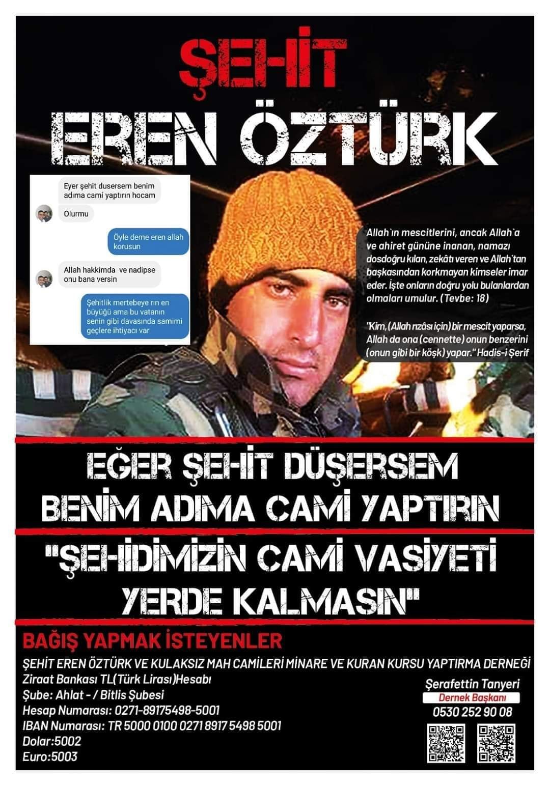 Şehit piyade uzman çavuş eren öztürk, bitlis'in ahlat ilçesinde ikamet ettiği kulaksız mahallesi'ndeki cami imamıyla 2016 yılında sosyal medya üzerinde yaptığı mesajlaşmada, eğer şehit düşersem. Şehit eren öztürk'ün vasiyeti üzerine yapılacak olan caminin resmi twitter hesabıdır.ziraat bankası ahlat şehit ere camii derneği tr50 0001 0002 7189 1754 9850. Şehit eren öztürk'ün vasiyeti üzerine yapılacak olan caminin resmi hesabıdır. Van'ın çaldıran ilçesinde geçen yıl pkk'lı teröristlerle çıkan çatışmada şehit olan piyade uzman çavuş eren öztürk'ün vasiyeti üzerine memleketi bitli. Van'ın çaldıran ilçesinde pkk'lı teröristlerin devriye görevi yapan askeri araca düzenlediği saldırıda şehit olan uzman çavuş eren öztürk'ün (28) cenazesi.